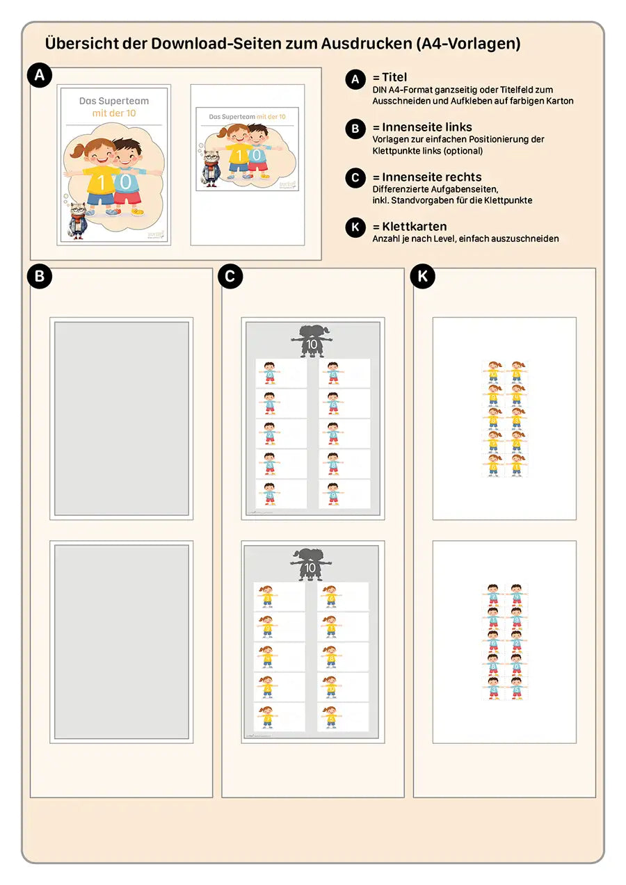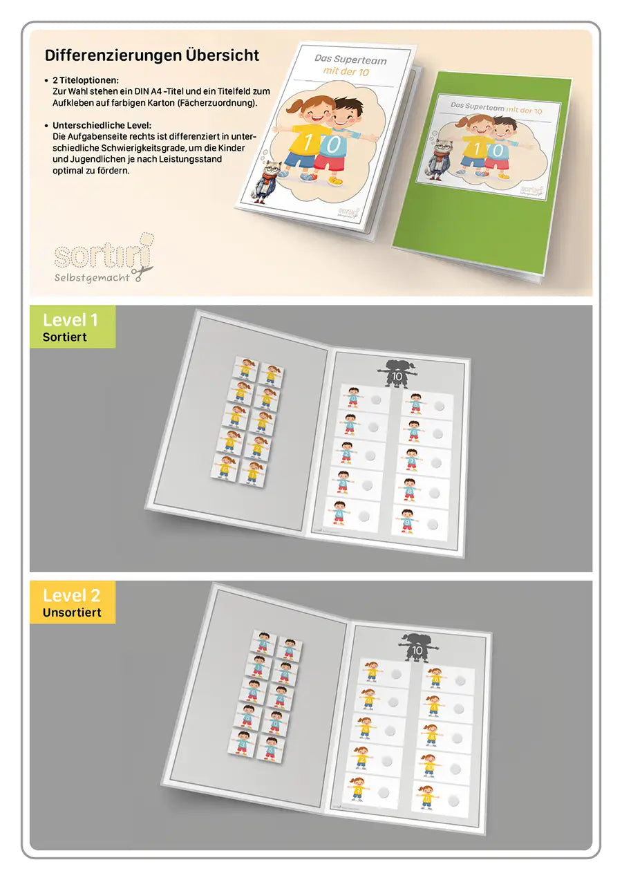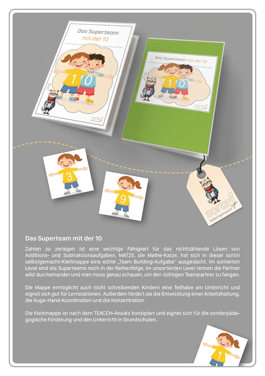 Zahlen zu zerlegen ist eine wichtige Fähigkeit für das nichtzählende Lösen von Additions- und Subtraktionsaufgaben. MATZE, die Mathe-Katze, hat sich in dieser sortiri selbstgemacht-Klettmappe eine echte „Team Building-Aufgabe“ ausgedacht. Im sortierten Level sind die Superteams noch in der Reihenfolge, im unsortierten Level rennen die Partner wild durcheinander und man muss genau schauen, um den richtigen Teampartner zu fangen.